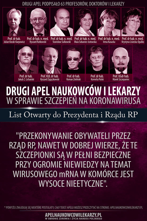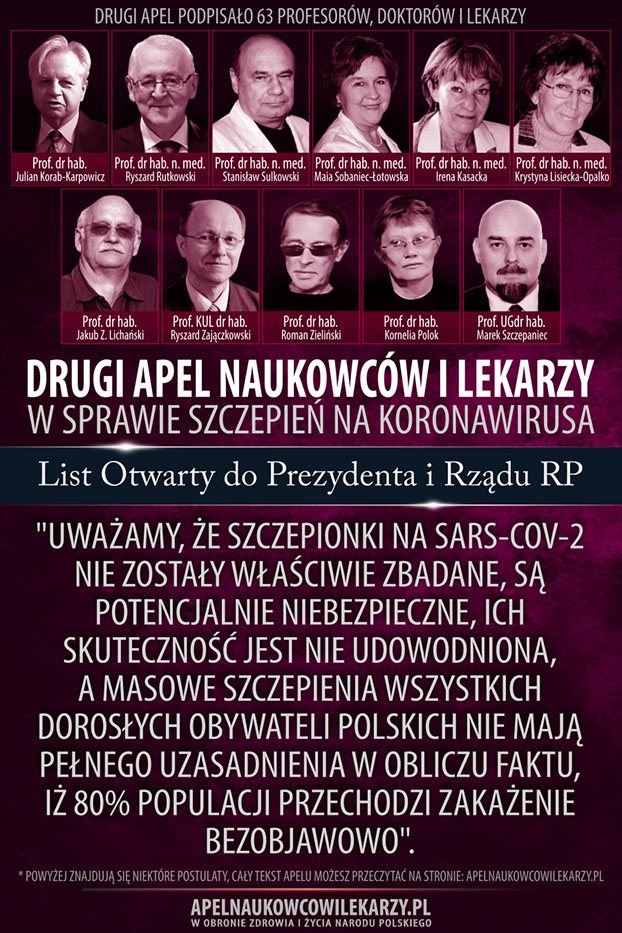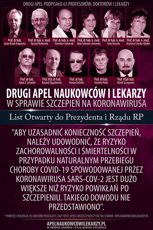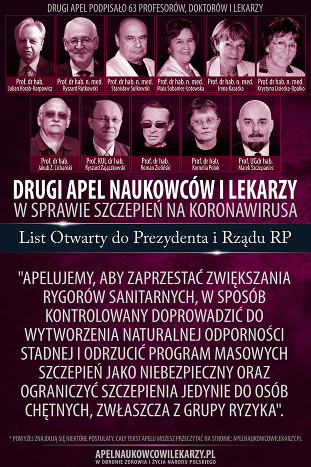 Środowisko naukowców i lekarzy, reprezentowane przez osoby podpisane pod tym apelem, pragnie ustosunkować się do Narodowego Programu Szczepień. Uważamy, że szczepionki na SARS-CoV-2 nie zostały właściwie zbadane, są potencjalnie niebezpieczne, ich skuteczność jest nieudowodniona, a masowe szczepienia wszystkich dorosłych obywateli polskich nie mają pełnego uzasadnienia w obliczu faktu, iż 80% populacji przechodzi zakażenie bezobjawowo. Drogą do zakończenia obecnej epidemii i powrotu do stanu normalności jest stopniowe zlikwidowanie obostrzeń i dążenie do wytworzenia w społeczeństwie naturalnej odporności stadnej, przy jednoczesnej ochronie osób starszych i innych z grup ryzyka.