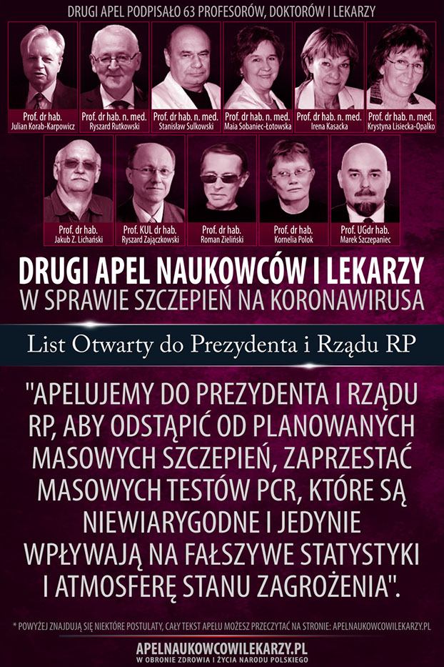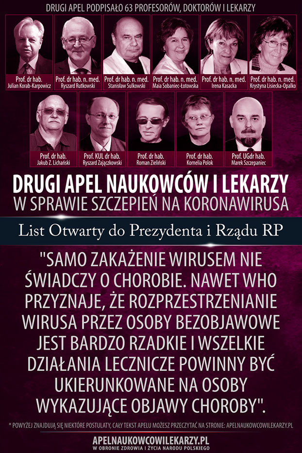 Dlatego my niżej podpisani apelujemy do Pana Prezydenta i Rządu RP, aby odstąpić od planowanych masowych szczepień; zaprzestać masowych testów PCR, które są niewiarygodne i jedynie wpływają na fałszywe statystyki i atmosferę stanu zagrożenia; zakończyć restrykcje i uwolnić obywateli polskich od obowiązku noszenia masek urągających ludzkiej wolności, a nie spełniających w większości wypadków funkcji ochronnych; nie paraliżować służby zdrowia przez zamykanie przychodni czy zastępowanie ich teleporadami, wysyłanie tysięcy lekarzy i pielęgniarek na kwarantannę oraz nie lekceważyć ludzi cierpiących na inne choroby; uruchomić w Polsce szerokie badania kliniczne nad lekami, takimi jak Amantadyna i innymi, które mogą okazać się skuteczne w leczeniu COVID-19; otoczyć szczególną opieką profilaktyczną ludzi starszych i zagrożonych. Postulujemy ponadto, żeby cały potencjał służby zdrowia być lepiej wykorzystany do leczenia wszystkich chorych. Część z nich w ostatnich miesiącach zdecydowanie częściej umiera nie z powodu COVID-19, ale na skutek innych chorób i braku dostępu do szybkiego i efektywnego leczenia.