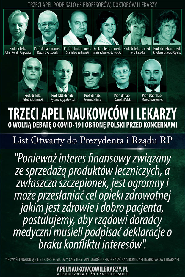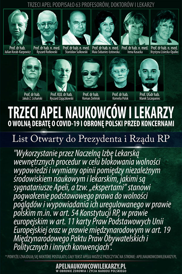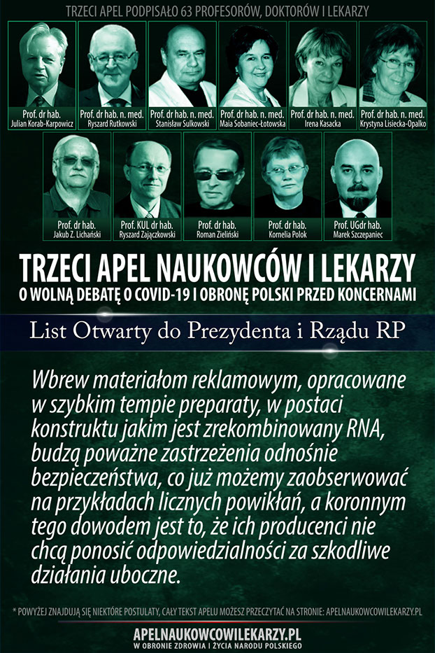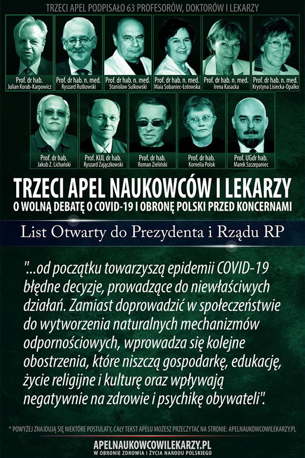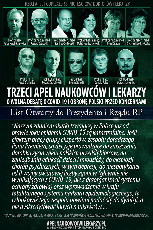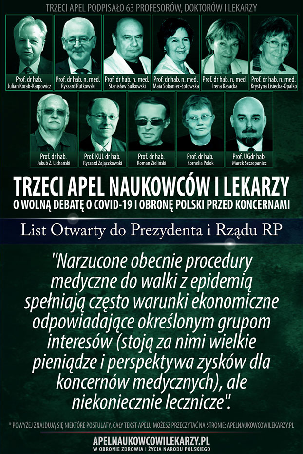 Środowisko naukowców i lekarzy, reprezentowane przez osoby podpisane pod tym apelem uważa, że od początku towarzyszą epidemii COVID-19 błędne decyzje, prowadzące do niewłaściwych działań. Zamiast doprowadzić w społeczeństwie do wytworzenia naturalnych mechanizmów odpornościowych, wprowadza się kolejne obostrzenia, które niszczą gospodarkę, edukację, życie religijne i kulturę oraz wpływają negatywnie na zdrowie i psychikę obywateli. Promuje się jednogłos grupy ekspertów. Próbuje się uciszyć naukowców i lekarzy o odmiennych poglądach,naruszając podstawowe prawo człowieka jakim jest wolność słowa. Apelujemy o rzetelną, wolną debatę publiczną o rzeczywistym wymiarze zagrożenia epidemiologicznego w Polsce, o zagrożeniach wynikających z masowych szczepień, o metodach zakończenia epidemii oraz o obronę Polski przed interesami obcych koncernów medycznych, dla których głównym interesem wcale nie musi być nasze zdrowie, ale zysk i sprzedaż szczepionek.