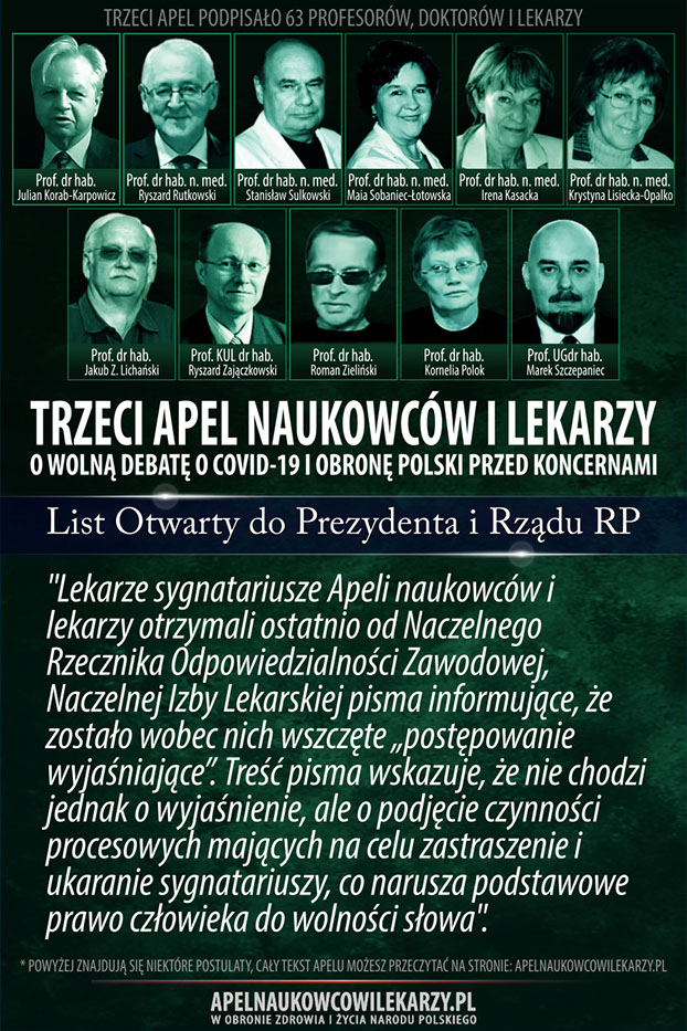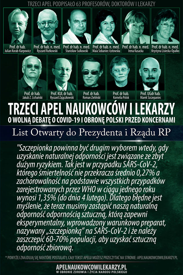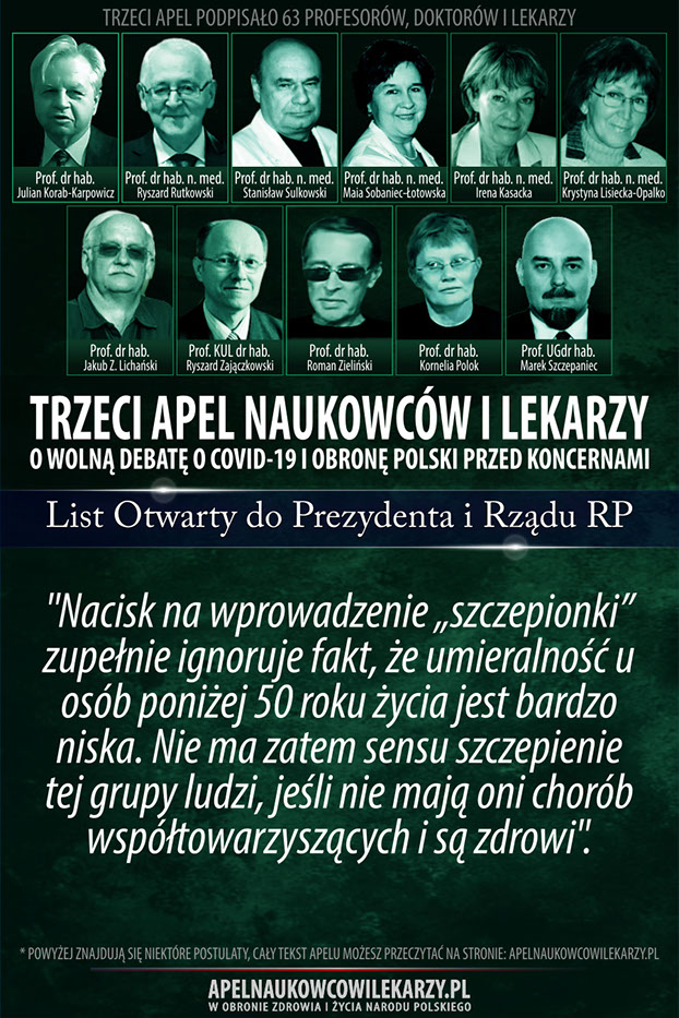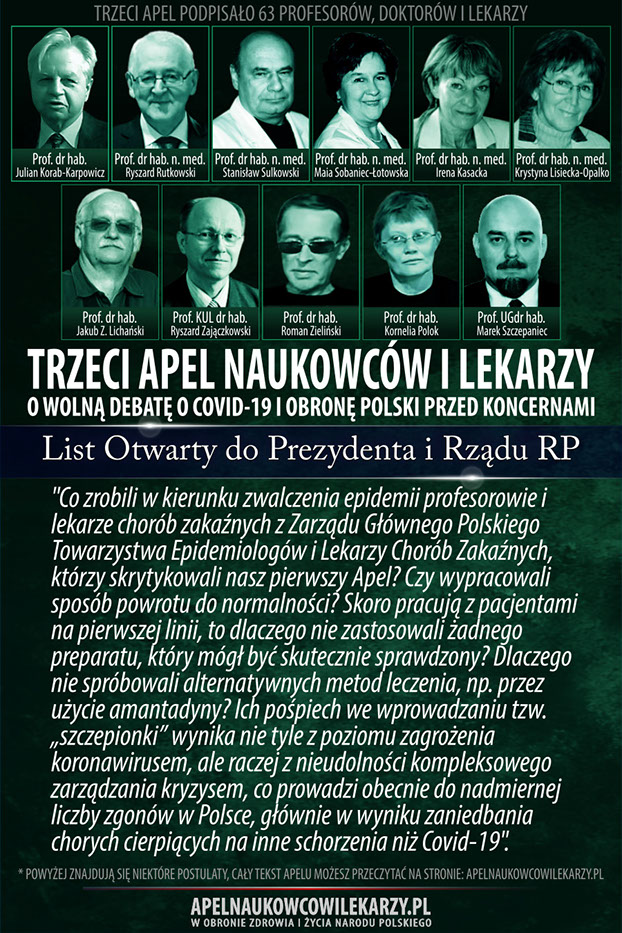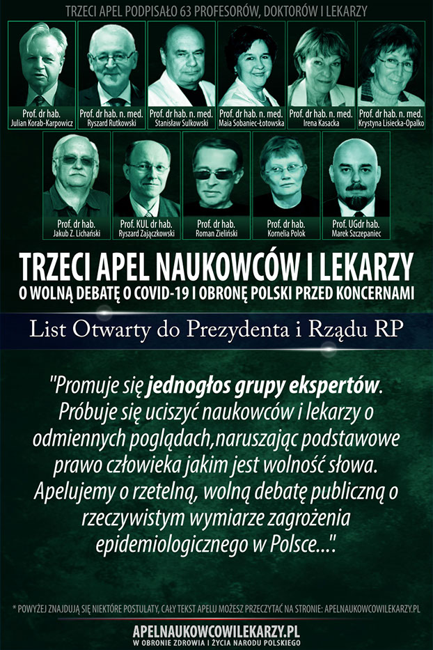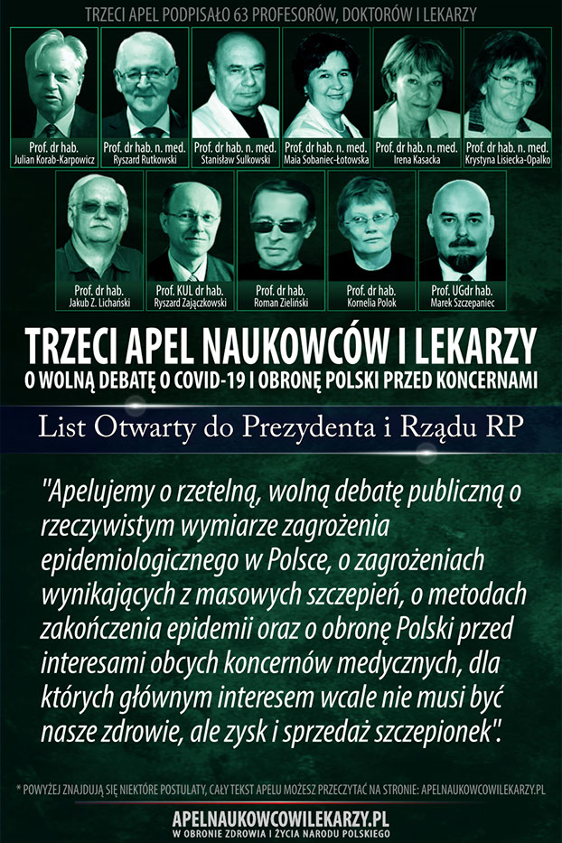 Środowisko naukowców i lekarzy, reprezentowane przez osoby podpisane pod tym apelem uważa, że od początku towarzyszą epidemii COVID-19 błędne decyzje, prowadzące do niewłaściwych działań. Zamiast doprowadzić w społeczeństwie do wytworzenia naturalnych mechanizmów odpornościowych, wprowadza się kolejne obostrzenia, które niszczą gospodarkę, edukację, życie religijne i kulturę oraz wpływają negatywnie na zdrowie i psychikę obywateli. Promuje się jednogłos grupy ekspertów. Próbuje się uciszyć naukowców i lekarzy o odmiennych poglądach,naruszając podstawowe prawo człowieka jakim jest wolność słowa. Apelujemy o rzetelną, wolną debatę publiczną o rzeczywistym wymiarze zagrożenia epidemiologicznego w Polsce, o zagrożeniach wynikających z masowych szczepień, o metodach zakończenia epidemii oraz o obronę Polski przed interesami obcych koncernów medycznych, dla których głównym interesem wcale nie musi być nasze zdrowie, ale zysk i sprzedaż szczepionek.